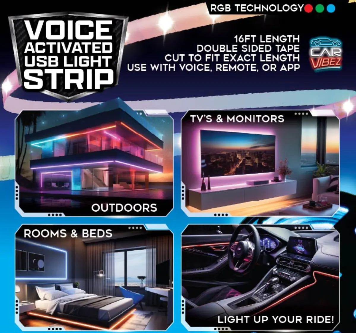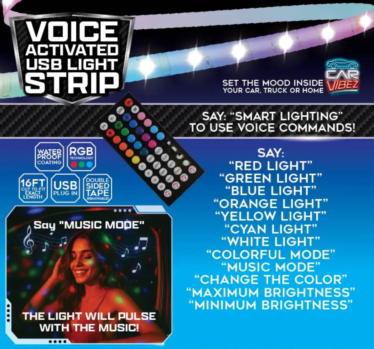 Create the perfect atmosphere anywhere with the Voice Activated USB Mood Light Strip. This 16-foot RGB strip can be cut to fit your exact space, whether in your car, home, or truck. Simply say “Smart Lighting” to control it by voice or activate “music mode” to have the lights pulse with your favorite songs! Control your lighting effortlessly via voice, remote, or app for a customizable and vibrant experience.
