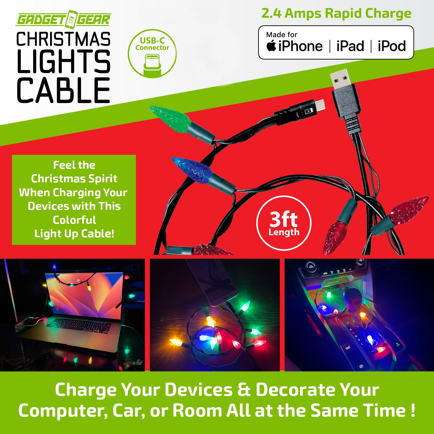 Brighten up your holidays with our festive 3FT USB-C Sync and Charge Cable. These colorful cables feature a 2.4-amp rapid charge. Get your car, home, and self-ready for the season with this Christmas light inspired design.