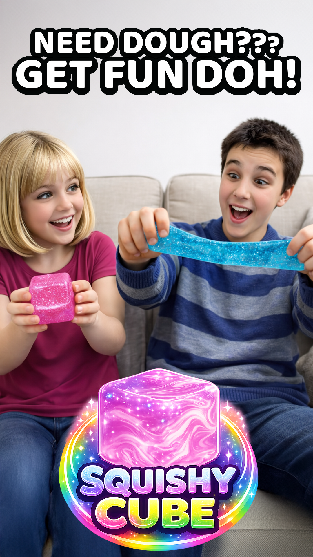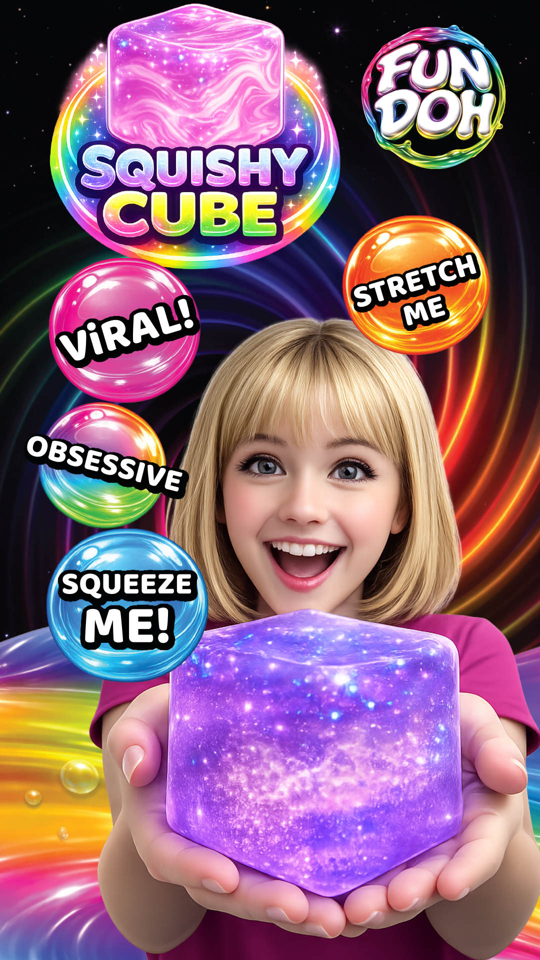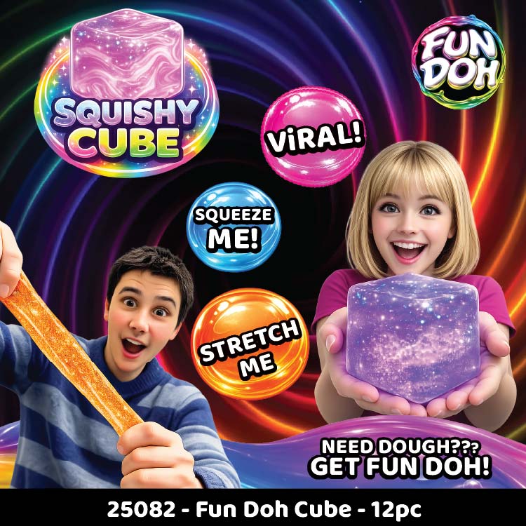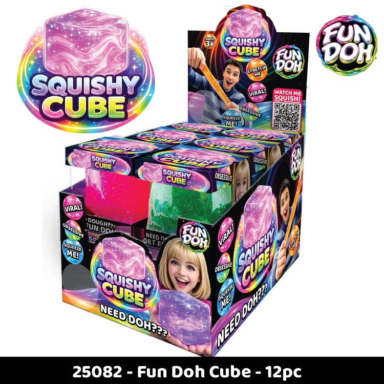 Need dough? Get Fun Doh! Get ready to squish, squeeze, and stretch your stress away with our Fun Doh Squishy Cubes! This display includes 12 colorful Cubes designed to provide endless hours of fidgeting fun. Say goodbye to stress and hello to relaxation with these delightful stress relief toys. Ages 3+.